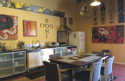Featuring a large and expansive, high-ceiling rustic living space, filled with original art, a cheerful big bathroom including a shower and a bathtub, a complete open kitchen with banquet seating for 5 people, a projection/meditation room, and sleeping up to FIVE (5) GUESTS*. Five stairs to climb to the raised bedroom platform with King size bed for two guests.