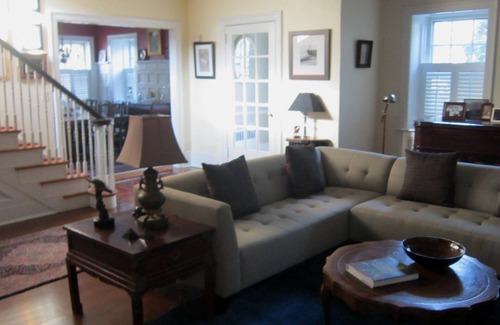 This expansive, fully restored 100 year old Georgian Colonial on 1/2 acre of park like grounds with large in ground pool. It has four floors of living space, including five bedrooms, four full baths, new kitchen, formal wainscoted dining room, living room with fireplace, sun room, TV/family room, renovated basement with large screen television, laundry room, WI-fi, and cable TV. The fourth floor is a magnificent master bedroom with separate dressing room, glass shower, and reading room. The express bus stop to the Port Authority in Manhattan in a three minute walk, with frequent express buses. The home is approximately 5000 square feet, all beautifully restored and immaculately maintained.