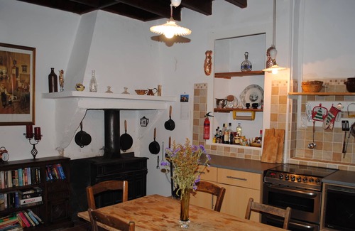 The cottage is on 4 levels. The front door leads to a hall, kitchen, bathroom and bedroom on the middle level. Up a few stairs are a further two bedrooms each with en suite bath/shower rooms. Down from the hall is a sitting/dining room with a large open fire place and doors leading on to the outside mezzanine deck which overlooks the pool and has stunning views across the local vineyards (where you can buy the local wine!).