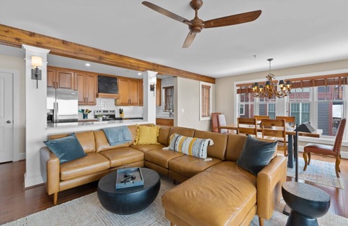 The open concept living area is tastefully furnished, providing a cozy ambiance for relaxation or socializing. The large windows showcase the awe-inspiring views of the surrounding mountains. There is a modern, fully equipped kitchen with all you need to prepare delicious meals. There is a cozy, gas-burning stone fireplace with remote control. A washer and dryer are available in the unit.