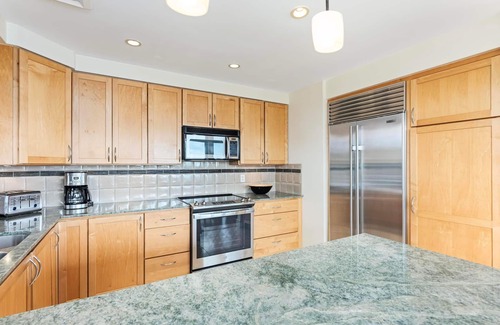 Fully equipped kitchen with modern appliances including a stove, oven, microwave, refrigerator, and dishwasher, alongside granite countertops
