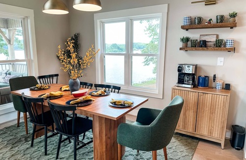 Welcome to the Nest: As you step inside, subtle mallard motifs and green accents guide your eye straight to sweeping lake views. The two story living room—with its striking accent wall—flows into a chef’s kitchen outfitted with stainless appliances, a 5 ft island, and all the gadgets you would need to cook up a delicious meal. The eight seat dining table is perfect for family feasts, while the coffee bar—stocked with K cups, loose teas, sugars & creamers—gets your morning off to a flying start. Cozy up on the sofa, stream your favorite shows, or simply watch pontoons drift by.