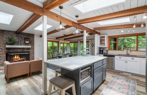 The kitchen has been updated with a expansive island and counter seating for four. It is well equipped for cooking meals, or simply bring in take-out and enjoy eating at dining table inside or outside (both accommodate 6). A BBQ with BBQ utensils is provided in the back garden deck area.