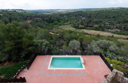 El Catllar: Old, rustic, historical farm estate "Mas d´en Tarres", 2 storeys, surrounded by fields. In a quiet position, 10 km from the sea, 10 km from the beach, in the countryside. Private: property 2 ha (fenced) with lawn and trees, natural garden, swimming pool (7 x 3 m, 21 m2, depth 120 - 150 cm, seasonal availability: 15.Jun. - 31.Sep.). Table tennis, barbecue, barbecue house, children's playground (slide, swing), parking (for 8 cars). Shop 3.5 km, grocery 3.5 km, supermarket 4.5 km, restaurant 3.5 km, bar 3.5 km, bus stop "El Catllar" 4 km, railway station "Torredembarra" 13 km. Please note: car recommended. Object suitable for 20 adults suitable for events.