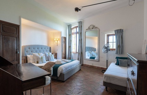 Beautiful and newly renovated 200-year-old stone villa with 6 bedrooms, set in gorgeous surroundings with olive trees, large heated swimming pool, boules court, and stunning views to the sea, the Esterel mountains, the picturesque hilltop village of Cabris and lake Saint-Cassien.