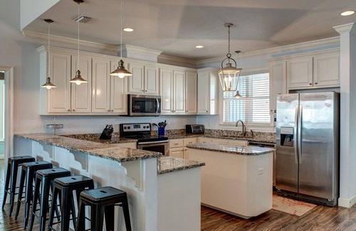 High Tide is an expansive 6-bedroom beach house right on the Gulf of Mexico. The home is maintained in a pristine condition and enjoys modern touches throughout, with beautiful lighting, a large open floor plan, and stunning views of the gulf from the living room and large gulf deck. The home is well furnished with plenty of seating, a large kitchen with an island, TVs in every bedroom, and 2 gulf side king suites! Six bedrooms and FOUR bathrooms make it easy for multiple families to relax and settle in for an extended beach vacation. The house is pet friendly with a $100 pet fee.