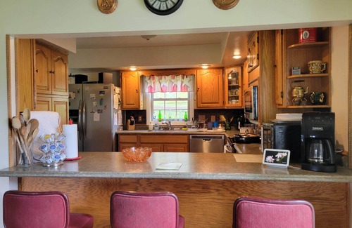 Inside the lodge, you’ll find three spacious bedrooms that ensure everyone in your group sleeps in comfort. Two master suites upstairs each feature a plush queen bed in one and a pair of twin beds in the other (with optional cots stored in the closets to accommodate a third guest in each room if needed), making them ideal for parents with a young child or friends sharing a room. Each master suite is tastefully decorated and offers its own scenic window views and en-suite feel (so everyone has space to unwind). The third bedroom downstairs includes a comfortable full bed and easy accessibility – great for grandparents or anyone who prefers no stairs. In total, the house sleeps 6–8 guests with ease. Extra cots and linens are available so larger families or groups of friends have flexibility in sleeping arrangements. 2 full bathrooms upstairs (stocked with towels and essentials) and a half bath downstairs, mean no one has to wait long to freshen up. You’ll also have a fully equipped kitchen and a large dining area, so home-cooked family meals or group dinners are a joy to prepare and share.
