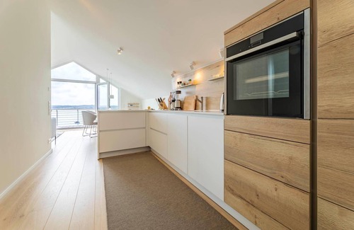 The "Meer" holiday apartment offers an impressive space for up to six guests, featuring stunning views of the Baltic Sea, the beach, and the adjacent nature reserve. The bright and modern interior is furnished with high-quality built-in furniture and design classics, ensuring a comfortable stay.