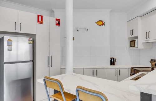 Merimbula Heights is a spacious, split-level holiday accommodation located in Monaro Street, Merimbula. Designed in a coastal style, it offers stunning ocean and lake views from its north-easterly aspect. The property features four bedrooms and two bathrooms, comfortably accommodating up to eight guests. The upper level includes two bedrooms, a modern kitchen, and an open-plan living and dining area that opens onto a wraparound balcony. The lower level comprises two additional bedrooms, another full kitchen, and a living area leading to a private decked courtyard. Amenities include reverse cycle air conditioning, gas log fire, Wi-Fi, multiple smart TVs, and a collection of books and DVDs. The property also offers a large outdoor BBQ area, two secure single garages, and additional driveway parking. Please note, pets are not permitted, and smoking is strictly prohibited indoors.