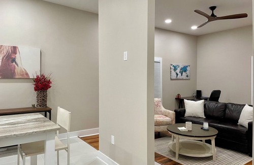 Welcome to your home away from home in charming Fort Mill! Built in 1950 and beautifully remodeled, this cozy retreat blends classic charm with modern comforts. Enjoy original hardwood floors, a serene bedroom with a king-size bed, a pull-out sofa, and two baths. The open-concept living area features high ceilings, natural light, and a fully equipped kitchen. Walk to Main Street, parks, dining, shopping and more, with easy access to Uptown Charlotte. A perfect spot to relax, work, and explore!