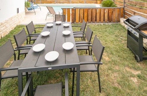 The exterior features a large area for enjoyment, a private pool with natural grass, an outdoor toilet and shower next to the pool, as well as outdoor furniture. The house is equipped with bed linen, towels, and a washing machine.