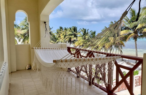 This 3 bedroom/2.5 bath 2880 square foot condo is in a beautiful, small beachfront complex just south of San Pedro on Ambergris Caye. You'll have a fabulous view of the sea from the large veranda — enjoy coffee, drinks & meals while gazing at the Caribbean!