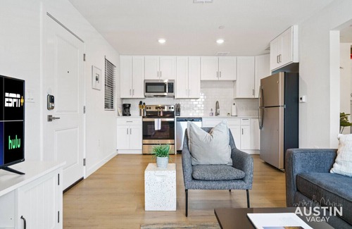 Welcome to your stylish haven in the heart of Austin! This modern 2-bedroom, 1-bathroom home accommodates up to six guests and is steps away from coffee shops and a fantastic restaurant in the building. Enjoy a cozy living room, fully equipped kitchen, plush bedrooms, in-unit laundry, and a charming courtyard. Free reserved parking makes exploring Austin`s top attractions a breeze.