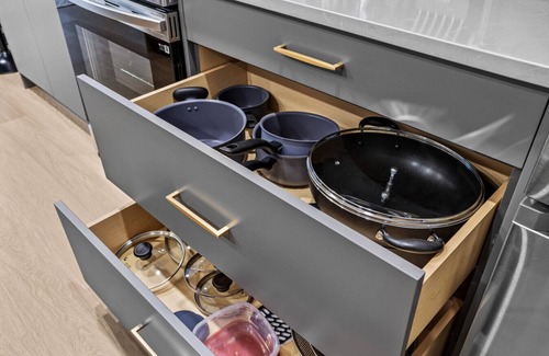 Enjoy cooking in our oversized, fully equipped kitchen featuring generous counter space, new appliances, cookware, dishes, utensils, and pantry basics.