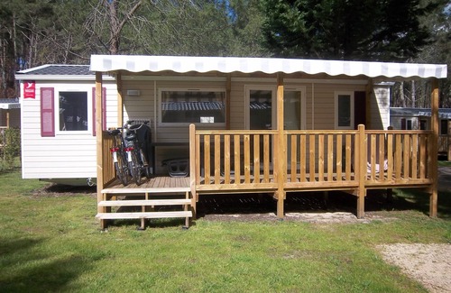 Rental mobile home 36 m² new collection 2017: 6/8 people, fully equipped, with 3 bedrooms: 1 master bedroom with storage (possibility to put a cot), 1 bedroom with 2 single beds, 1 other bedroom with 2 beds individual. Living room with convertible sofa, TV, washing machine, equipped kitchen, bathroom and separate WC… a large covered terrace, Plancha, garden furniture, deckchairs, 2 bikes are available to you…