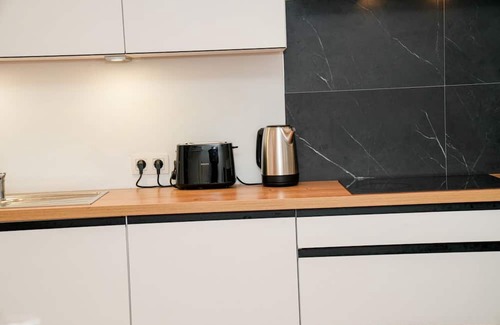 In the living room, a cozy sofa bed offers additional sleeping space for 2 guests, complemented by a Smart TV for your entertainment. Altogether, the apartment can comfortably accommodate up to 4 guests.