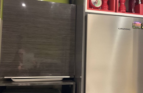 Fully fitted compact white kitchen with white gloss cabinets, white washing machine and big fridge freezer. Gas cooker, grill and microwave provided. The big cooker is a Gass cooker Zanussi -guests can cook on the cooker but there is no oven for baking inside oven. Microwave is provided and separate mini grill cooker also in the kitchen to be used. electric two plate cooker is also provided if guests prefer using simpler electric cooker.