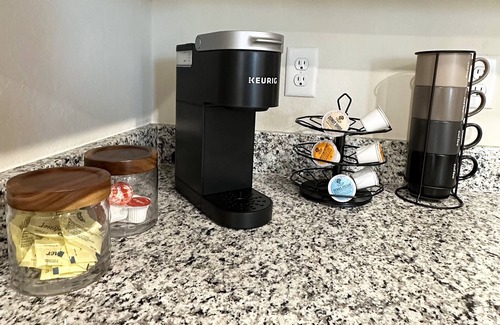 Tall, tasteful curtains adorn the windows, adding an elegant touch to the overall decor. The kitchen features new stainless steel appliances and granite countertops that effortlessly combine functionality and style. Indulge in the delightful Keurig station, complete with a variety of Keurig mugs, cream, sugar, and locally sourced San Antonio coffees. Start your mornings in a blissful haze as you sip your favorite brew. Bathrooms also showcase these luxurious countertops, providing a touch of opulence during your daily routines.