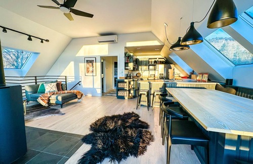 Head upstairs to the large, open living room and kitchen, bathed in sunlight at all hours of the day. Off the living room, you’ll find two sliders to the brand new second floor deck and a Stuv wood stove for chilly nights. From this room, you’ll have absolutely stunning views of the 24 acre property out back (which is yours to explore!), Mt Mansfield aka Stowe Mountain Resort (where you can watch skiiers rip down the mountain or hikers climb up through your binoculars!), and a local farm to the right where you can sometimes hear the cows in the morning. Wake up in the morning with a coffee after grabbing some from local VT roasters The Roastery and watch beautiful sunsets over the mountains on the deck in the evenings. Grab some local beef or meat from the farm right next door (5 min walk) and cook a delicious meal in the fully stocked kitchen, with Caraway pots and pans, plateware from CB2, new appliances, and more. The table and bench nook in the kitchen were also designed by us and custom made by a local VT carpenter.