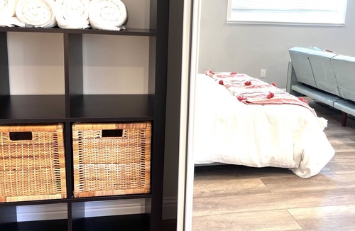 Whether you are in town for leisure or business, you are in for a stylish experience at this centrally-located cottage. This 400-sq ft space will meet all your travel needs! Snuggle in bed under the soft microfiber linens atop the Nectar Memory foam mattress. Relax on the sofa that also functions as a folding bed while watching a favorite movie on the smart TV. And wake up to a cup of dripped coffee made from locally sourced coffee grinds.