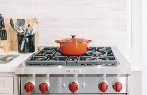 - Wolfe stovetop/oven, microwave, fridge, ice-maker all included; equipped for light cooking (dried spices, oil, pots, pans, etc)