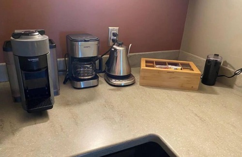 If you don’t feel like dinner out, cozy up and prepare a meal on the Bosch gas cooktop using the full host of kitchen utensils and spices. Kitchen gadgets include coffee pot, Nespresso coffee maker, blender, electric tea pot, popcorn maker, and toaster.
