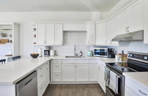The open-concept living area is ideal for gathering with friends and family. The kitchen is fully stocked with coffee, tea and other cooking essentials finished with sleek countertops and modern appliances. A cozy dining nook offers stunning views of the property through large bay windows.