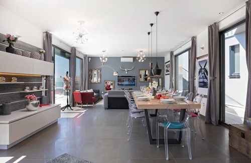 The Birdhouse Villa can accommodate up to 10 people on 380 sqm living space on two air-conditioned floors. The rooms in the house are very spacious so that only the living area is 75 sqm big, and to the feeling of comfort and spaciousness also contribute the 3m high ceiling and 2,4m high inside doors. On the ground floor there is a living area with equipped kitchen, dining table with designer Ghost chairs and three sofas, two double bedrooms, each with private shower/toilet, one of them with bathtub in the room, a separate toilet. On the first floor, there are three double bedrooms, each with private shower/toilet and exit to the terrace.