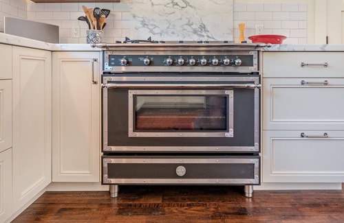 --Full kitchen with blender, microwave, coffee maker, toaster, cookware, marble counters, Bertazzoni gas range, wine refrigerator, dog dish