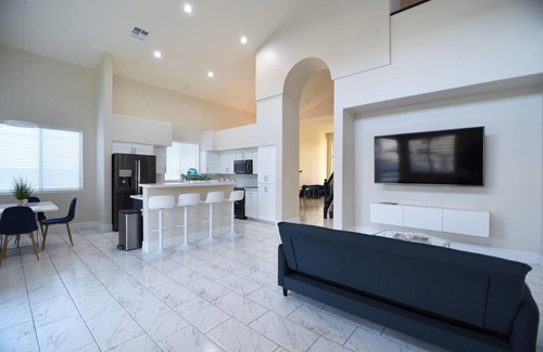 This fabulous home is complete with 4 bedrooms, consisting of: 1 king bed, 3 queen beds, and 1 sleeper sofa. 3 completely renovated full bathrooms. Master bath has a tub for relaxation. The open living spaces are made up of beautiful marble-style flooring and finishes, plenty of seating in our cozy breakfast nook, kitchen island, and formal dining table.