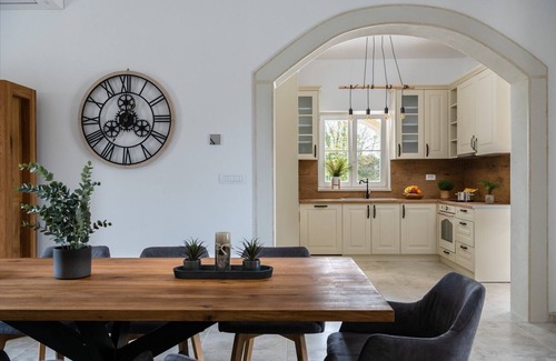 The villa has 4 elegantly decorated bedrooms and 4 fully equipped bathrooms. The house is divided into two floors. On the ground floor there is a spacious living room filled with natural light, a rustic kitchen with a large dining table ideal for gathering the whole family, and two bedrooms with their own bathrooms. The living room is decorated with a large stone fireplace that gives the space the warmth and comfort you can't wait for. There are two bathrooms and bedrooms left on the first floor. One room has access to a large balcony with access to the pool, and the other has a view of a beautiful olive grove. All bedrooms have double beds made of solid wood, air conditioning and LCD TVs.