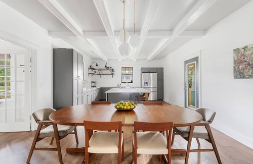 This meticulously updated historic home features two large bedrooms, both with luxury ensuite bathrooms. The open living area has everything you will need to gather, cook, and dine, or you could choose to use the gas grill and dine al fresco in the courtyard. Guests of all ages will enjoy the recreational activities available in the fully fenced outdoor space - a putting green, bocce court, cornhole, frisbee golf, and a gas fire pit. For those who prefer to be inside, the pool table in the game room will not disappoint.