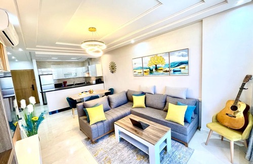 Nestled among Tangier's best hotels, this new and elegant 2-bedroom apartment in a modern glass building boasts a long list of amenities. 3 elevators. 3 AC units, fully equipped kitchen to cook that delicious meal. Enjoy the high-speed wifi, free parking, Netflix movies, and 100s of live TV channels.