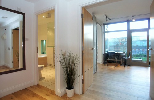A modern 3 bedroom, 2 bathroom flat with balcony. The apartment has wood flooring and large windows facing South West overlooking a park. The bedrooms each have a double bed, one with an en suite shower room and there is a family bathroom.