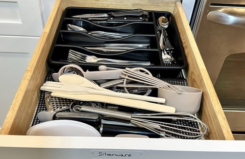 We have a fully-stocked kitchen with plenty of room to cook your favorite meals. There's also a stocked coffee bar with k-cups, ground coffee, and a variety of sweeteners.