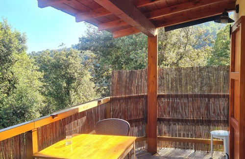 Come and relax in this beautiful tranquil forest studio. Wake up to the sound of birdsong and breath in the fresh mountain air. Then have breakfast on your own private balcony whilst taking in the spectacular views of the valley below and the Mediterranean coastline. The secluded studio is part of a 9000 sq metre property surrounded by nature but easily accessible by road (which stops just after the house then it becomes a track.) The main house is far enough away for you to enjoy complete privacy but we like to tell our guests that we are are there if you need help. The bed is very comfortable and we include fresh bed linen, large bath towels and hand towels which are changed every week. If you enjoy hiking there are many trails for you to enjoy and remote historic buildings for you to explore. Up to 2 dogs are welcome at no extra charge and they can enjoy the freedom of running around with our 2 friendly resident dogs. There is a shared salt water pool and a bbq area aswell as a covered dining area. There is free Wi-Fi - suitable for Digital Nomads. The nearest villages are only 5 minutes drive away at the bottom of the mountain with shops, supermarkets and a weekly market selling fresh locally grown fruit and vegetables. There are some highly recommended restaurants and tapas bars in both villages. The train station is only 15 mins away and paking is free. The R2 Renfe train runs every half hour to Barcelona and the airport taking only 45 mins to central Barcelona.