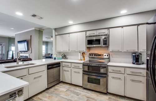 Beautifully updated Townhome on the gorgeous Lake LBJ with 4 bedrooms and 3.5 baths. Huge dining room for big gatherings. Amazing views of the lake from the 700 sq. ft deck. Just walk right out the door just 10 steps from the boats and water. Many outdoor areas for gathering. There is a community pool, firepit and deck area overlooking the lake. This townhome has recently been wonderfully updated with new tile flooring , quartz counter tops, paint and all new master bath. 2 Living areas with huge TV's for multiple families. Bottom floor has separate refrigerator and wet bar. 2 bedrooms have King size beds. Incredible area downstairs for kiddos to bunk. Great split plan for several families.