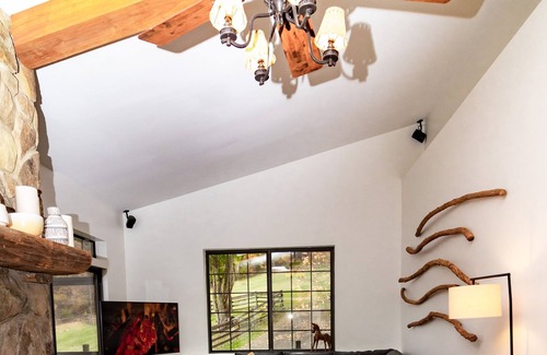 Please note that the living quarters are built into the barn. The main floor includes the full bathroom, king suite, living area, dining area and kitchen. The second bedroom including the queen bed and full bed is on the second floor of the barn where guests will walk through the barn to travel between the living spaces.