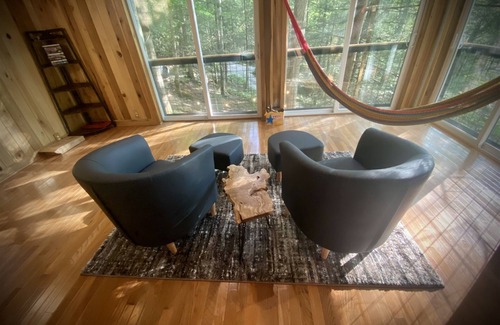 Porch space: There are two porch spaces, one on the front, the second on the back of the cabin. The front porch has an excellent 'chill' vibe with hanging lights and a great view. The back porch faces the firepit and has a small tin roof---to enjoy the sounds of the rain on just that perfect kind of relaxation-day!
