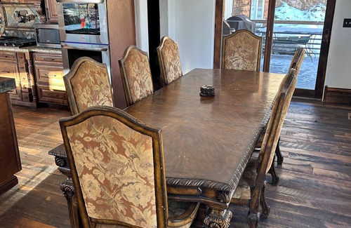 This 5000 square foot cabin sits on 37 acres with AMAZING 8500 elevation mountain views from every room. Get cozy sitting by the crackling fire sipping your coffee. Just a couple miles to the 285 highway and restaurants in Bailey, the Treehouse Adventure Park, the wedding venue, and borders the National Forest. Enjoy a quick hike in the backyard or a long trek in the adjacent National Forest or even hunt during the hunting season. The open main level has all reclaimed barn wood floors, large windows, and a beautiful log staircase. You will enjoy cooking for your party with the extensive island, copper farmhouse sink, 6 burner gas stove, double ovens and BBQ. The second story has 4 bedrooms and 4 bathrooms (3 bedrooms with ensuite bathrooms). The master bedroom has an attached sitting area with recliners and TV, and the master bathroom is currently dated but functional and scheduled for a remodel. The walk out daylight basement features game and exercise areas, and an additional bunk room for sleeping. You will find ping pong, pool table, electronic basketball hoop game, and foosball in the basement. Half baths are on the main and basement levels. This lodge like house has been remodeled in almost every area. In this spectacular house, you will find a few areas that are indicative of a remodel in progress such as some missing trim or drywall needing texture. Even with that the house is impressive. Current beds- 1 king, 4 queens, 3 twins, pack and play (upon request).