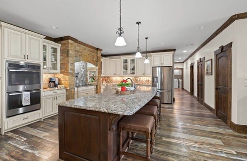 This gated private estate is featured in the rolling hills of Cleveland, TN, and showcases top-of-the-line amenities around every corner. On the Mountainside Manor grounds, you will find a fully stocked pond, panoramic mountain views, multiple outdoor fire-pits, three indoor stone fireplaces, and a custom-designed (unheated) pool that includes swim-up barstools over the infinity edge, a water slide, a stone waterfall with a shaded cave, multiple pop-up water streamers, and a kid-friendly walk into the pool. By the pool house, you will have access to the outdoor grill, outdoor dining, lounge chairs and patio seating, corn hole, and a swing. The pool house is available to rent as well for an additional charge, it is not included when booking this property as is, the pool house can sleep up to 4 more guests and has a kitchen, private bathroom, Queen bed, and a Queen sleeper sofa. Outside of the manor, you will find a two-story patio and deck that have multiple seating spaces, one fire pit, and stunning views of the property and lake.