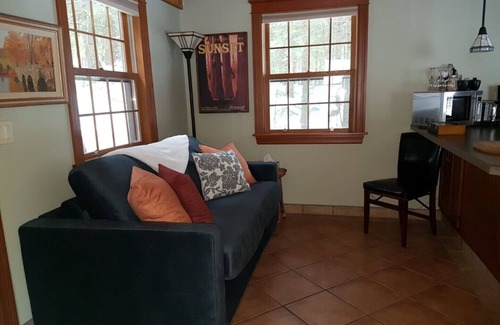 Accommodations consist of two private units - a cabin and a yurt - nestled in the woods, set back from the river and secluded from our home. With a booking of either unit, guests may inquire directly to book RV/trailer/tent sites at an extra charge. Pets are welcome to stay in the cabin for a fee but must be accompanied at all times. Guests share access to a gazebo, firepit, picnic tables, pond and dock; the river is accessible from the dock for swimming, fishing, tubing, kayaking or canoeing.