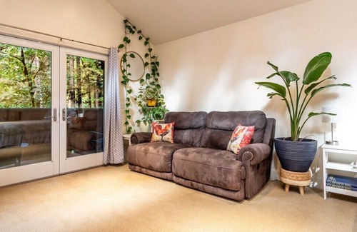 Inside, the living room continues the cozy ambience of our yard. Dimmable recessed lights let you set the mood while our plush sectional sofa reclines for extra comfort. A small gas stove (thermostat controlled) adds a dash of old-world charm and our smart TV awaits your favorite shows and movies. We also have a Bluetooth sound system so you can stream music and podcasts from your phone or tablet.