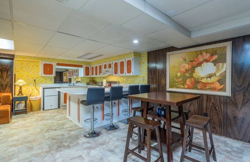 The lower level will take you back to the seventies where you will find a full kitchen, with a mini fridge and lots of bar space and seating, a large living room with a foosball table and corn hole games for the family to enjoy, a dedicated workspace and one private bedroom.