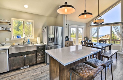 Get a taste of what it’s like to live in the Alaskan wilderness at this 3-bedroom, 2.5-bathroom home. This Anchorage vacation rental is perched within the mountains, nestled among the trees and featuring stunning views of the Chugach range. Head to Beluga Point to do some whale watching, go skiing at Hilltop Ski Area, or hit Downtown Anchorage for great restaurants and museums near the coast. End the day watching the sunset over the peaks from the deck or warming up by the wood-burning stove.