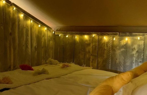 Accessed via a ladder, a small double bed lit with fairy lights - perfect for children but big enough for adults who like being cosy!