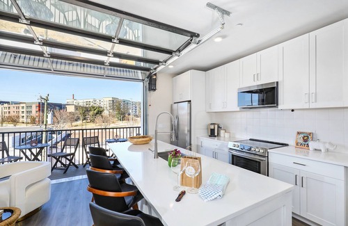 This immaculate condo is located in wonderful downtown Nashville and resides in the newly constructed Muse community. Offering amazing city views from its private balcony, two well-furnished suites, and a central living and dining area, find all the comforts of home when you stay here. A unique garage door opens up to create a seamless flow between the living area and the outdoor space. High-speed WiFi makes streaming a breeze, while a smart TV in each bedroom adds an extra layer of entertainment.