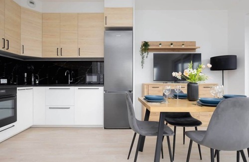 The 45 m² apartment is designed for four people, offering comfort and functionality in a modern way. The living room with kitchenette is the heart of the apartment, which was designed with comfort and functionality in mind. Subdued colors and elegant accessories create a cozy atmosphere. The spacious living room is equipped with a modern sofa, a table with four chairs and a TV with access to cable channels. Thanks to large windows, the interior is full of natural light. The kitchenette, which is an integral part of the living room, is fully equipped with modern appliances, such as a refrigerator, dishwasher and induction hob. All necessary dishes and utensils are at guests' disposal. From the living room you can step out onto a cozy balcony, where you can enjoy the fresh air while drinking your morning coffee or relaxing after a long day. A separate bedroom is an oasis of calm, designed for maximum comfort. It features a comfortable double bed with a high-quality mattress, bedside tables with reading lamps and a spacious closet for clothes. Subdued colors and elegant accessories create a cozy atmosphere. The modern bathroom is equipped with a shower cubicle, a sink with a large mirror and a toilet. In addition, towels and basic toiletries are at guests' disposal.