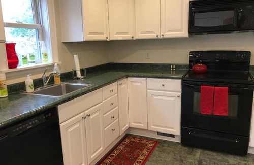 It opens up to a large deck with a dining table and chairs and a small charcoal grill. From both kitchen and deck you will be able to enjoy our suburban wildlife (mostly birds and squirrels -- but also a large red tail hawk who lives in a tree a couple houses up the hill!)