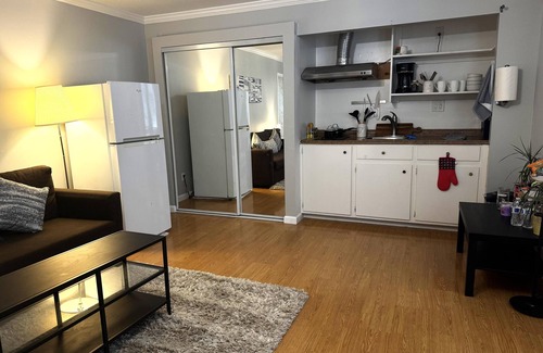 This is the in-law unit in a quiet street. The unit comes with a small and private kitchen with essentials such as utensils, coffee maker, microwave, pots, pans, refrigerator and some can foods.